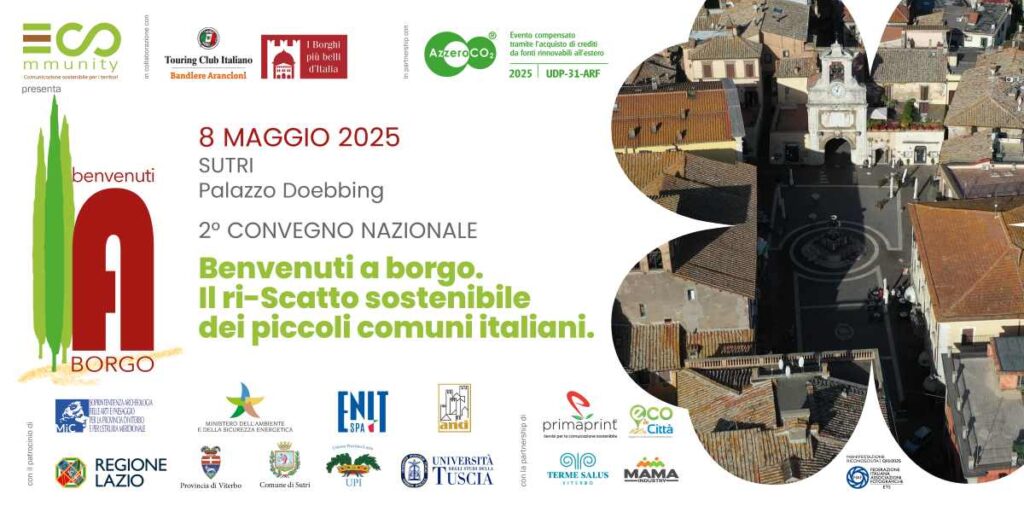 ECOmmunity, organizzazione che si occupa della ideazione e realizzazione di eventi sostenibili per i territori, in particolare meeting volti alla valorizzazione dei borghi italiani, presenta l’edizione 2025 di “Benvenuti a borgo. Il ri-Scatto sostenibile dei piccoli comuni italiani”, che avrà luogo giovedì 8 maggio (ore 9-13,30) presso Palazzo Doebbing a Sutri, antico borgo della Tuscia riconosciuto Bandiera Arancione del Touring Club e associato a I Borghi più belli d’Italia. Il convegno ed evento espositivo, realizzato con la collaborazione del Touring Club Italiano Bandiere Arancioni e dell’Associazione I Borghi più belli d’Italia, invita associazioni, istituzioni, imprese e università a confrontarsi su borghi e sostenibilità, binomio inscindibile nelle politiche di crescita nazionali ed europee.