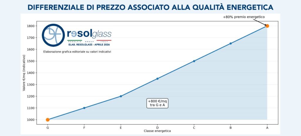 Secondo le elaborazioni Resolglass, il differenziale di prezzo associato alla qualità energetica può arrivare fino all’+80% tra edifici in classe G e classe A, con scarti fino a +800 €/mq e dinamiche ancora più marcate nei grandi mercati urbani come Milano, Roma e Napoli, dove il differenziale tra immobili inefficienti ed efficienti può sfiorare anche i 3.000 euro al metro quadro.