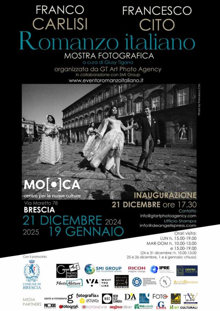 Si svolgerà dal 21 dicembre 2024 al 19 gennaio 2025 con il patrocinio del Comune di Brescia nello Spazio espositivo del MO.CA Centro per le nuove culture del Palazzo Martinengo Colleoni di Brescia la mostra Romanzo italiano” con le opere fotografiche di Franco Carlisi e Francesco Cito.